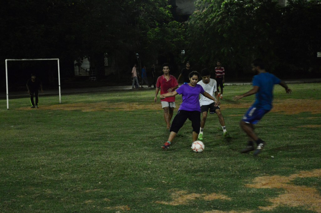 The game commenced and within a few seconds, the first goal of the match was scored by Siddharth Natraj, assisted by Thulunga Basumatary, both from the fifth year. The excitement and frenzy of the first minutes subsided, and the game slowed down a bit. Thulunga was in the thick of things, reaching everywhere the ball was and creating chances.. Around the 6th minute, he went in for a shot which was saved by Melwin James, the third years’ goalkeeper. The fifth years dominated possession of the ball for the first half of the match, despite a corner kick by Rimil Hembrom going in vain. The third years were pressing for a goal, and Karnalius Basumatary, ably assisted by Sree Hari A.P, scored a goal at the end of the 8th minute.The ever-present dogs at Sangam disturbed a few seconds of the game when they ran onto the field, but it soon resumed. An eventful first half thus came to an end, with scores tied at 1-1.