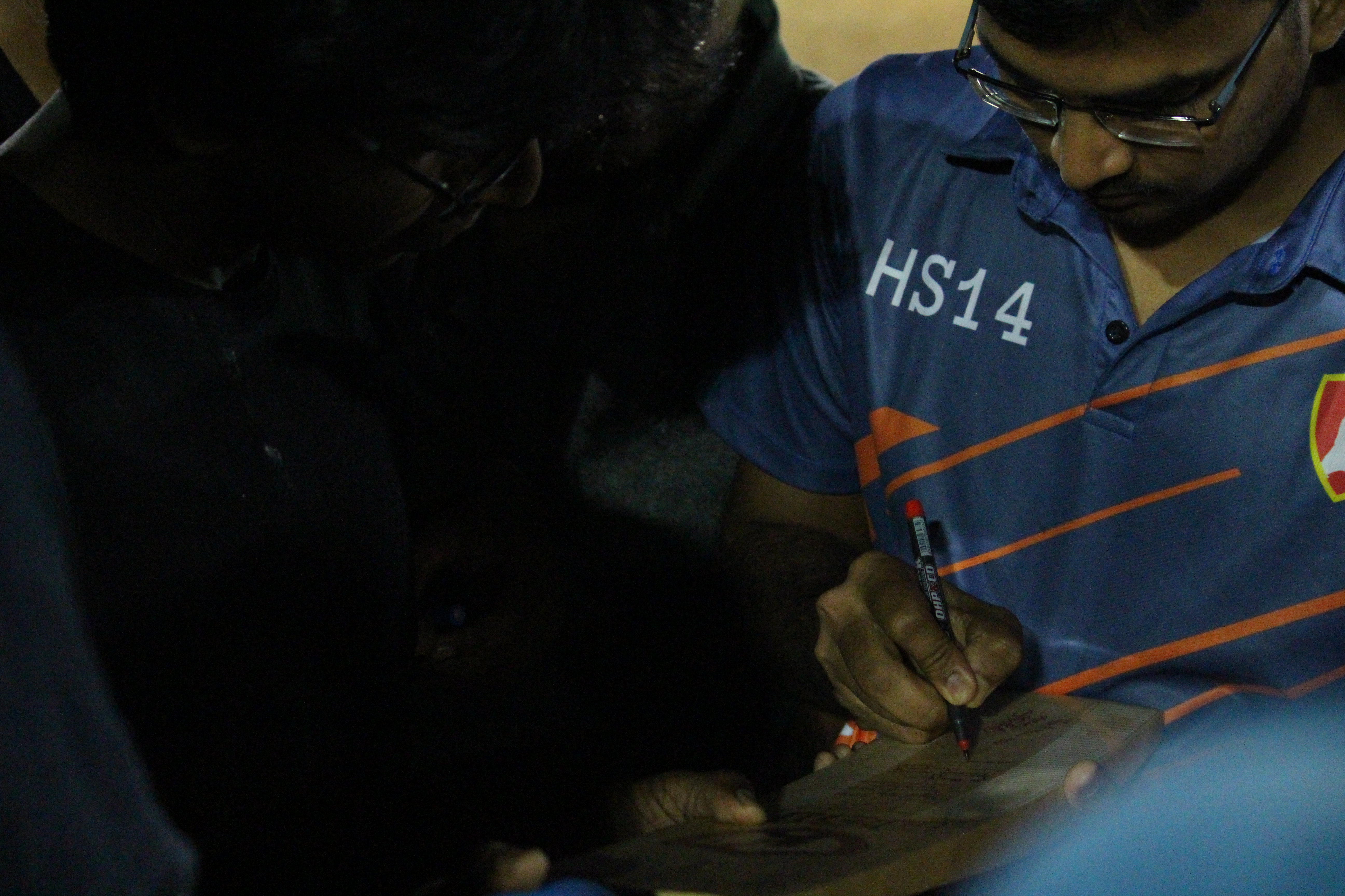 The post match affairs were of much fun. HS16 paid tribute to the outgoing batch by presenting them a custom designed bat. The champions wrote their messages on the bat and autographed it. This bat is to be displayed in the department for the coming batches to wonder upon and hopefully, get inspired. Several of the team members spoke on their experiences and hopes for the tournament. The trophy was presented to the captain Santosh following which photo sessions began.