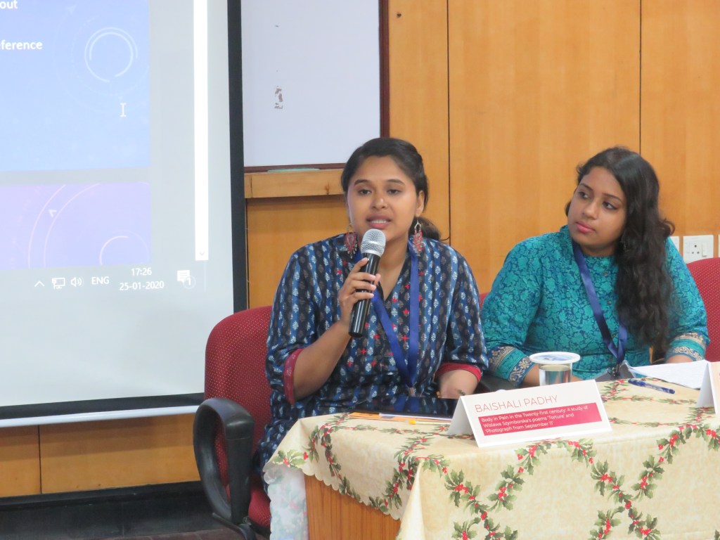 The 7th panel of the conference was titled Violence and Literature, and was moderated by Dr. Divya. The first speaker, Baishali, began by referring to Elaine Scarry’s The Body in Pain. She described how experiencing physical pain leads to the destruction of language, since language becomes inadequate to communicate or express the reality of that physical pain to those who are not in pain themselves. A crucial factor of pain is its presentness, the fact that it has a temporal aspect. To express pain, it becomes necessary to objectify it. The speaker used the poetry of Wislawa Szymborska to explore such images of pain. The first poem, titled “Tortures”, dealt with the unmaking of the victim’s world in response to torture, and the collective memory of 9/11. She mentioned how technology has lengthened our lifespans, but has not changed how we experience suffering. She also read torture as deprivation, and saw moments of pain as being frozen in poetry. Pain has remained the same from the prehistoric times until now, and the act of inflicting pain remains the same although society has progressed. Our capacity to negotiate with pain remains the same, and it is often justified to maintain social hierarchies. The second poem was titled “Photograph from 9/11”, based on an actual photograph from the New Yorker. The poem has a slanted structure, which can be seen as a metaphor for the body in freefall. The poem provides vivid descriptions of pain, and draws out the tension between static and movement. The slow paced pain of impending death means that one dies a thousand deaths in anticipation of that moment, and sees their life flashing before their eyes. There are also multiple layers of pain that cannot be expressed, again harkening to the idea that language is insufficient to express pain. Physical pain in this poem is a way to resist resistance.