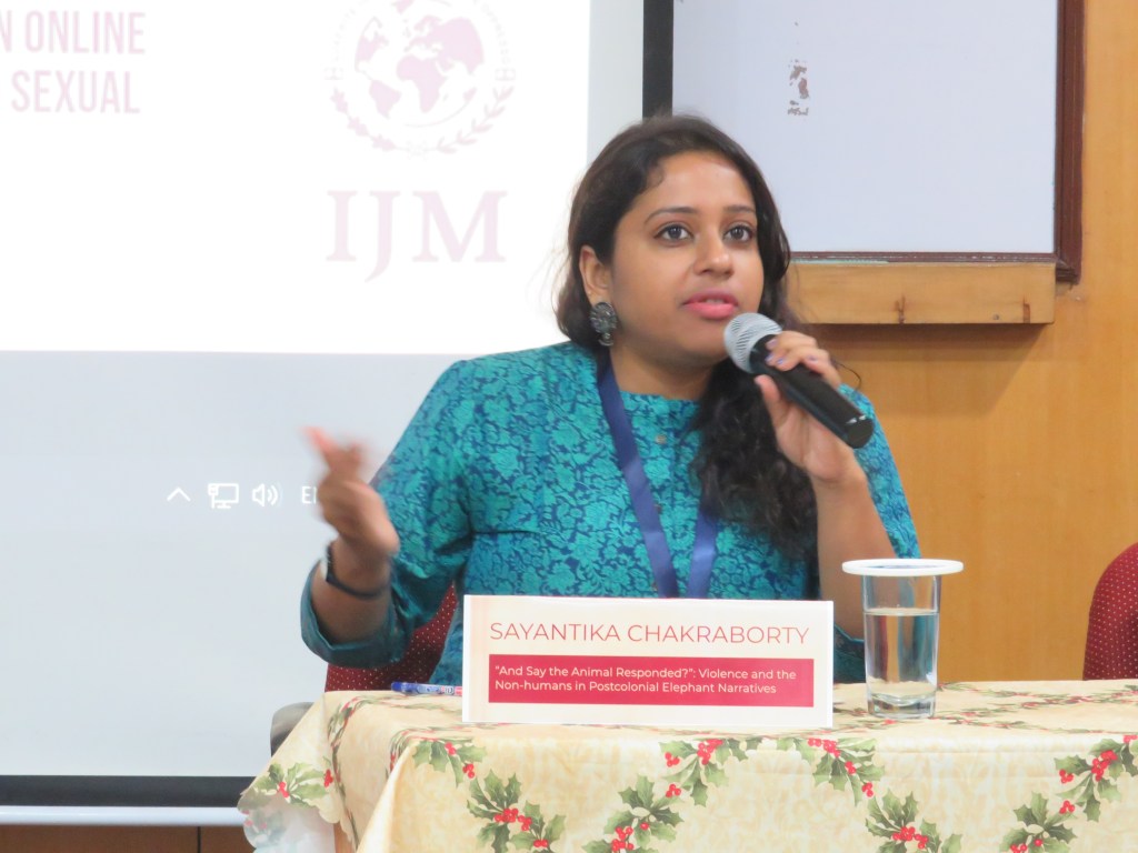 The second speaker, Savantika, presented her paper on Violence and the Non-humans in Postcolonial Elephant Narratives. She explained how postcolonial studies assign a marginal status to animals because of the fear of ignoring the human narrative. However, it also offers interesting insights into the prevailing norms of the time, including how metaphors of bestiality were used to refer to Dalits as pariahs, and so on. The speaker sought to reconcile this human-animal distinction by looking at connection and interaction between humans and no-human animals in two texts. The journeys of the elephants in these narratives are intertwined with that of the humans, and they become victims of human ambition and greed. The brutality of violence inflicted on them in captivity is part of the painful process of making them suitable for human needs. The texts also show how the elephants are attributed human qualities, and also describe how the turn from victims to perpetrators. In The Tusk that Did the Damage, the elephant Gravedigger displays psychological gratification after killing humans for revenge, although he eventually displays remorse. In The Elephant Company, Bandula, who is named after a bloodthirsty and vicious general, also becomes a killing machine. The second strand is just as problematic as the first, due to the covert, epistemic violence it displays by interpreting non-humans as a monolith. Since there will always be gaps in our understanding of animals, it becomes necessary to maintain a respectable distance.