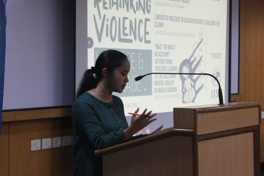 The ninth and final panel of the Conference was on Violence and Language, moderated by Prof. Rajesh Kumar. With three speakers from across the country, it covered topics of semantic, linguistic and emotional violence. The first panelist was Afrida Aainun Murshida from Sikkim University, who presented her paper on ‘Linguistic Violence in Salman Rushdie’s Shalimar the Clown’. She talked about how language is one of the most common yet pervasive vehicles of violence. Addressing the efforts of South Asian diaspora to undo linguistic violence, especially by authors who struggle between their mother tongue and adopted language, she took the case of Salman Rushdie and his employment of a ‘language in use’ as a problematic example of violence in language. She explored two sections in her paper – linguistic violence and violence in language – and went on to say how the metapragmatic and metadiscursive study of language can be used to analyse the linguistic violence inherent in postcolonial diasporic ‘Englishes’. These features can be used to question how elements of language such as idioms, genres and styles can control the functioning of language. She quoted various examples from the book that supplemented her point. She shed light on the narratives of gendered violence, the breakdown of language in the passages about genocide and the emphasis on religious zeal in ‘Shalimar the Clown’.