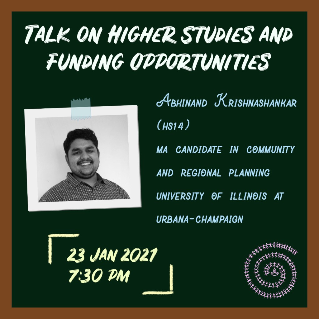 As part of the Placement, Apping and Competitive Exams Fundae Series organised by the Department Council, a higher session fundae session was conducted on the 23rd of January 2021. This was the first session of the series and it went on for about an hour. The fundae session was conducted by Abhinand of the HS14 batch, who is currently pursuing his M.A in community and regional planning at the University of Illinois at Urbana Champaign. The session followed a Q&A format and primarily focused on American higher studies experience. The major points of his session are given below.