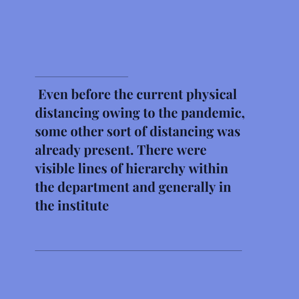 Also, despite me feeling welcomed here from the beginning, I found that it was not the general case in the department. Many students didn’t get that welcoming environment from the department. That is to say, even before the current physical distancing owing to the pandemic, some other sort of distancing was already present. There were visible lines of hierarchy within the department and generally in the institute. The experience as a collective is actually very lacking. However, it needs to be said that these hierarchies are not exclusive to IIT Madras. It exists everywhere as a reflection of our society. But I believe, we can and need to actively work towards overcoming these pervasive forms of hierarchies by promoting solidarity among ourselves.