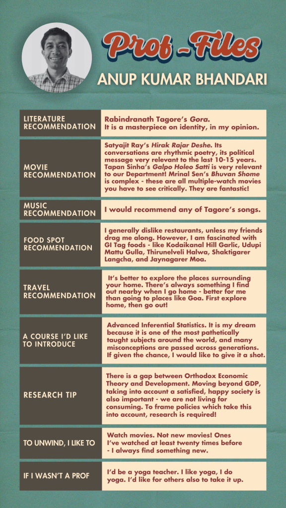 Satyajit Ray’s Hirak Rajar Deshe. Its conversations are rhythmic poetry, its political message very relevant to the last 10-15 years. Ray’s final movies Jana Aranya and Agantuk are also masterpieces. Tapan Sinha’s Galpo Holeo Satti is very relevant to our Department! Mrinal Sen’s Bhuvan Shome is complex – these are all multiple-watch movies you have to see critically. They are fantastic!
