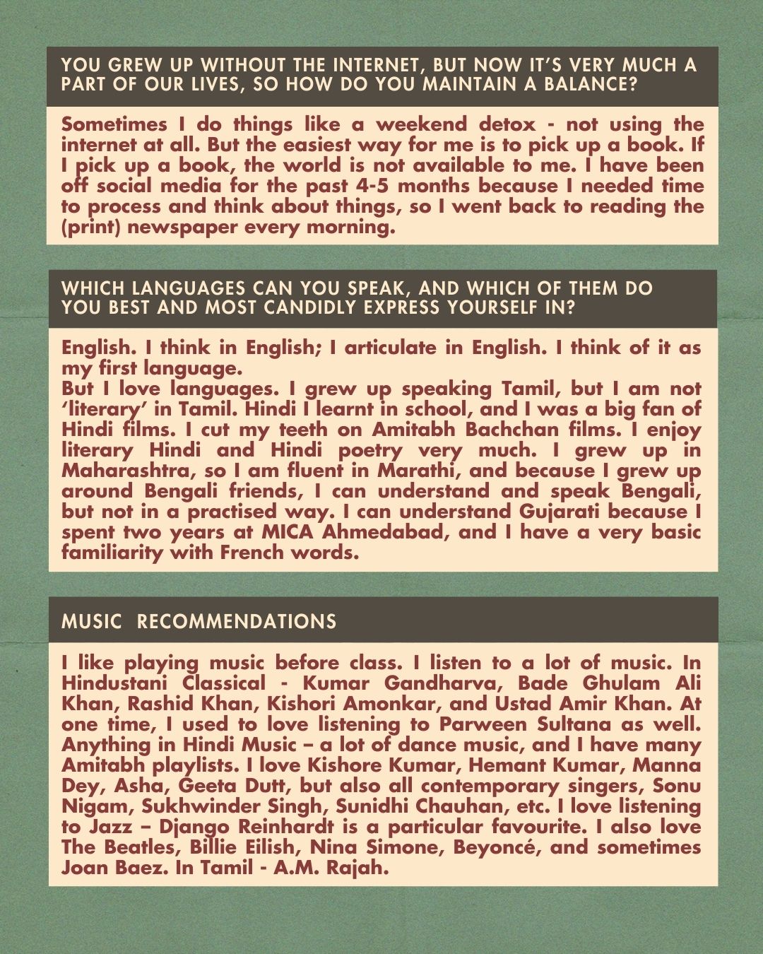 But I love languages. I grew up speaking Tamil, but I am not ‘literary’ in Tamil. Hindi I learnt in school, and I was a big fan of Hindi films. I cut my teeth on Amitabh Bachchan films. I enjoy literary Hindi and Hindi poetry very much. I grew up in Maharashtra, so I am fluent in Marathi, and because I grew up around Bengali friends, I can understand and speak Bengali, but not in a practised way. I can understand Gujarati because I spent two years at MICA Ahmedabad, and I have a very basic familiarity with French words.
