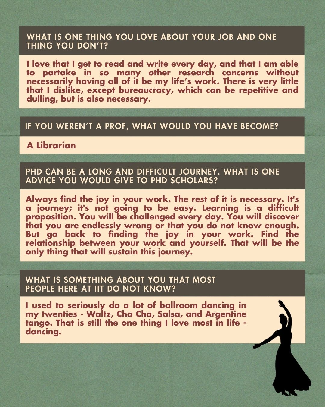 I like playing music before class. I listen to a lot of music. In Hindustani Classical – Kumar Gandharva, Bade Ghulam Ali Khan, Rashid Khan, Kishori Amonkar, and Ustad Amir Khan. At one time, I used to love listening to Parween Sultana as well. Anything in Hindi Music – a lot of dance music, and I have many Amitabh playlists. I love Kishore Kumar, Hemant Kumar, Manna Dey, Asha, Geeta Dutt, but also all contemporary singers, Sonu Nigam, Sukhwinder Singh, Sunidhi Chauhan, etc. I love listening to Jazz – Django Reinhardt is a particular favourite. I also love The Beatles, Billie Eilish, Nina Simone, Beyoncé, and sometimes Joan Baez. In Tamil – A.M. Rajah.