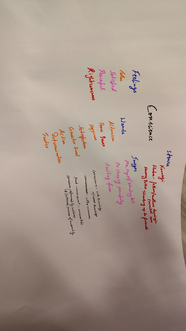 Do we dare to dream of a world that rids itself of conscience? We all echoed ‘No’ in unison. Conscience is tied to feeling humane, and therefore is a fundamental aspect of feeling human. It is the inner voice that helps us think critically and challenge ourselves, and teaches us to narrativise life. It is both within us and detached from us, constituting the ‘transcendental self.’ As we left our private corners to exchange maps of conscience with one another, Mr Tikoo encouraged us to pursue conscience as a path to discover the values within ourselves and in each other, as opposed to relegating it to the realm of rigid moral discourse of right and wrong.